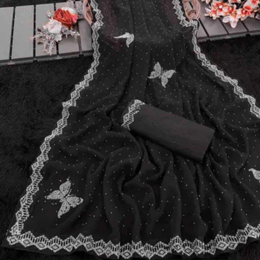 S4s Black Siroski Butterfly Stones Lace Georgette Party Wear Saree